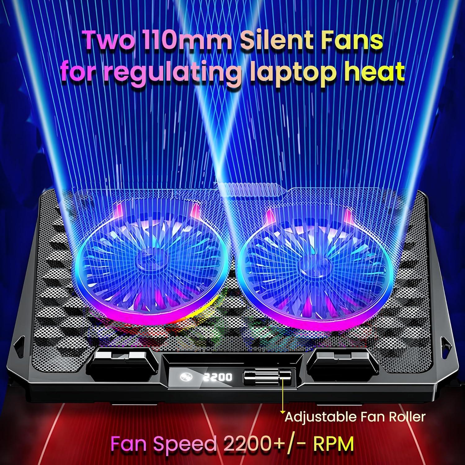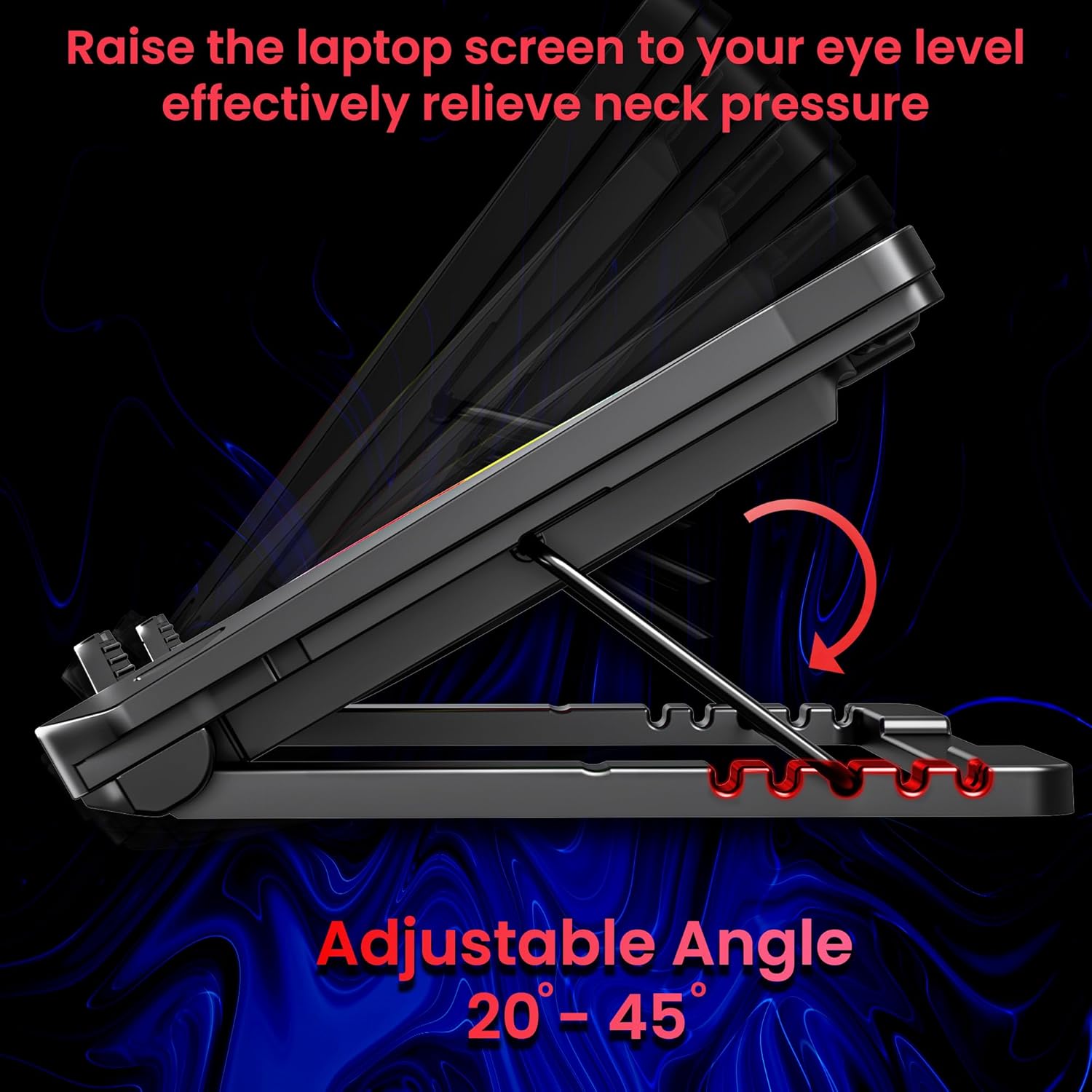 - Adjustable Height & Non-Slip Baffles: Find perfect stability and comfort with our laptop fan stand cooling pad. Double non-slip baffles securely anchor your laptop on any surface. Five adjustable height function reduces neck strain during extended use, ensuring comfort throughout.