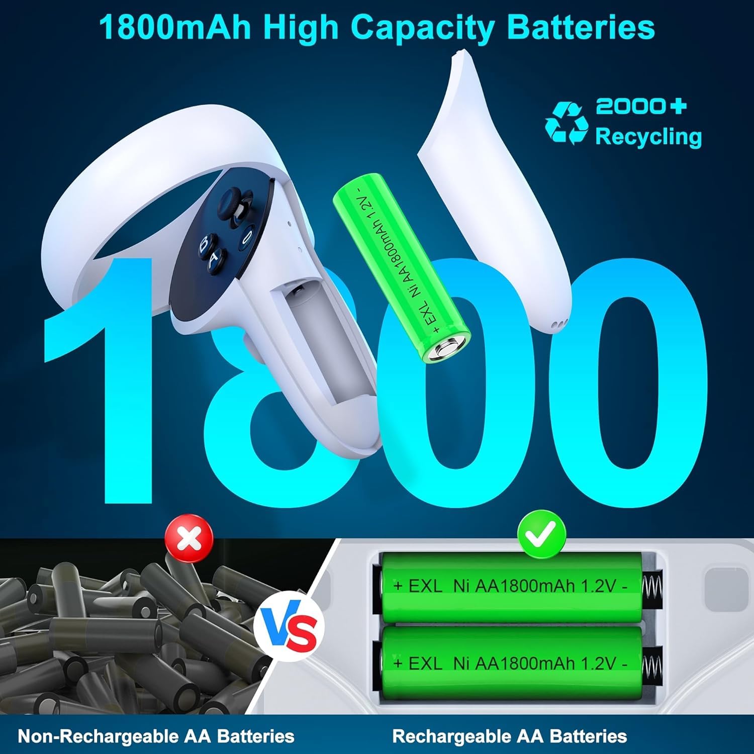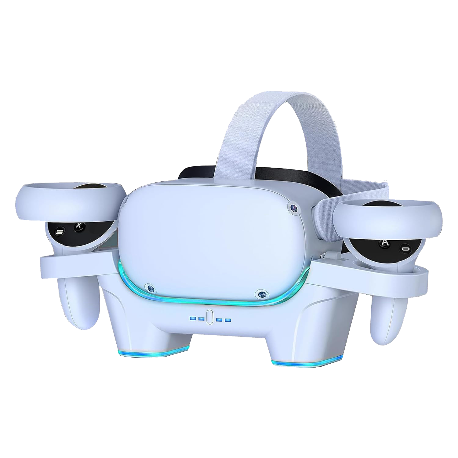 - RGB Charging Station for Oculus/meta quest 2-Specifically designed for the headset, this charger station for Oculus 2 comes with two 1800mAh rechargeable batteries for the controllers, eliminating the need to frequently purchase dry cells. The batteries can be conveniently stored in the charging dock.