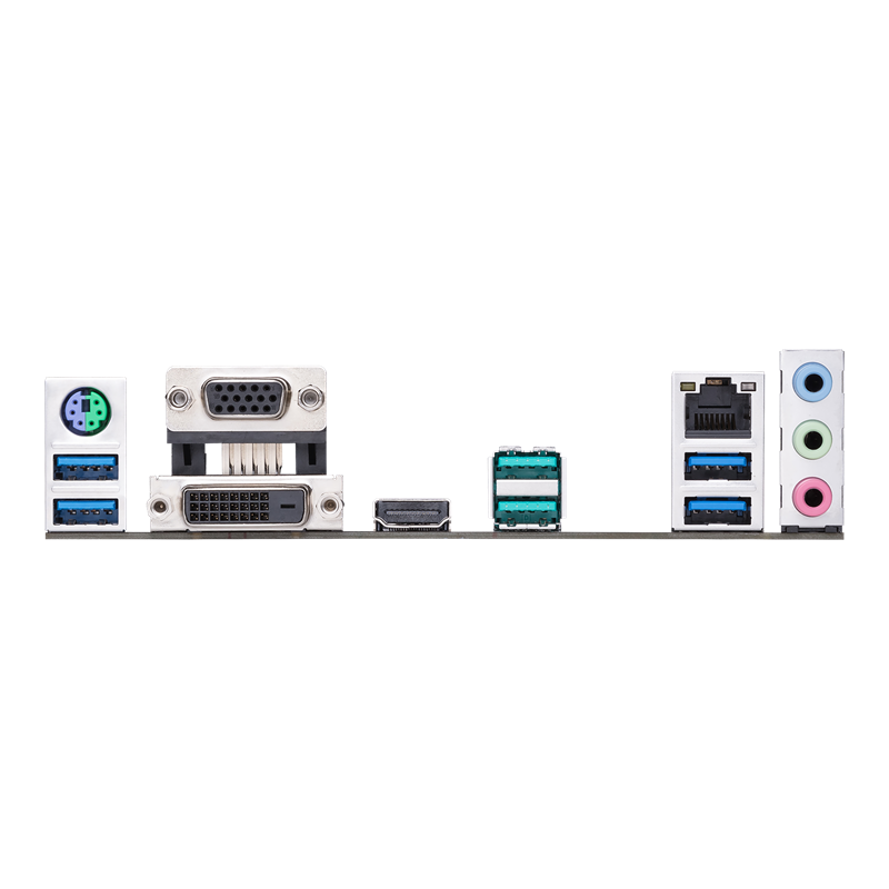 | Back I/O Ports | 2 x USB 3.2 Gen 2 (teal blue) (2 x Type-A),4 x USB 3.2 Gen 1 (blue) Type-A,1 x DVI-D,1 x D-Sub,1 x PS/2 keyboard/mouse combo port(s),1 x HDMI,1 x LAN (RJ45) port(s),3 x Audio jack(s) |