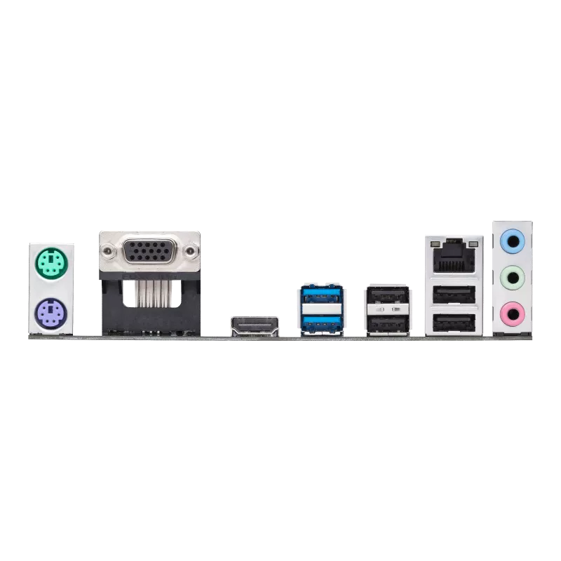 | Back Panel I/O Ports | 2 x USB 3.2 Gen 1 ports (2 x Type-A) 4 x USB 2.0 ports (4 x Type-A) 1 x D-Sub port 1 x HDMI port 1 x Realtek 1Gb Ethernet port 3 x Audio jacks 1 x PS/2 Keyboard (purple) port 1 x PS/2 Mouse (green) port |