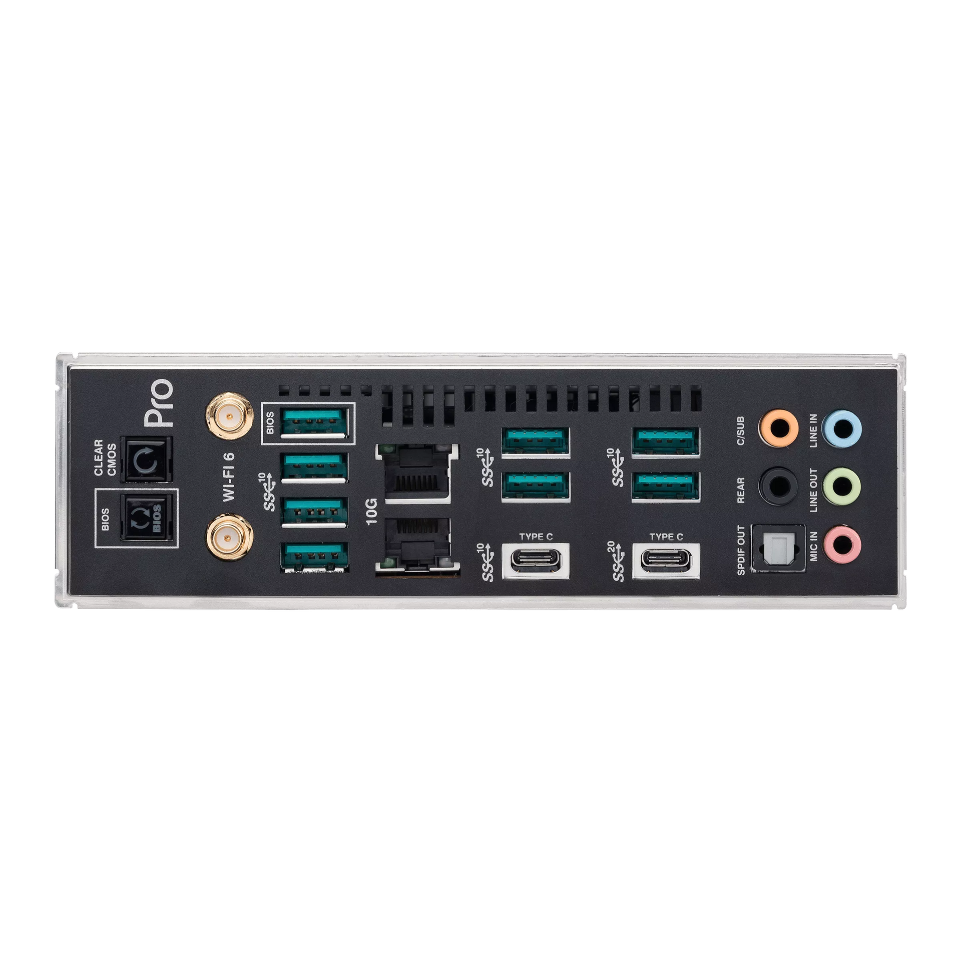 | Back Panel I/O Ports | 1 x USB 3.2 Gen 2x2 port(s) (1 x USB Type-C) 9 x USB 3.2 Gen 2 port(s) (8 x Type-A+ 1 x USB Type-C) 1 x Wi-Fi Module 2 x Intel X550-AT2 dual 10Gb Ethernet ports 5 x Audio jacks 1 x Optical S/PDIF out port 1 x BIOS FlashBack button 1 x Clear CMOS button |