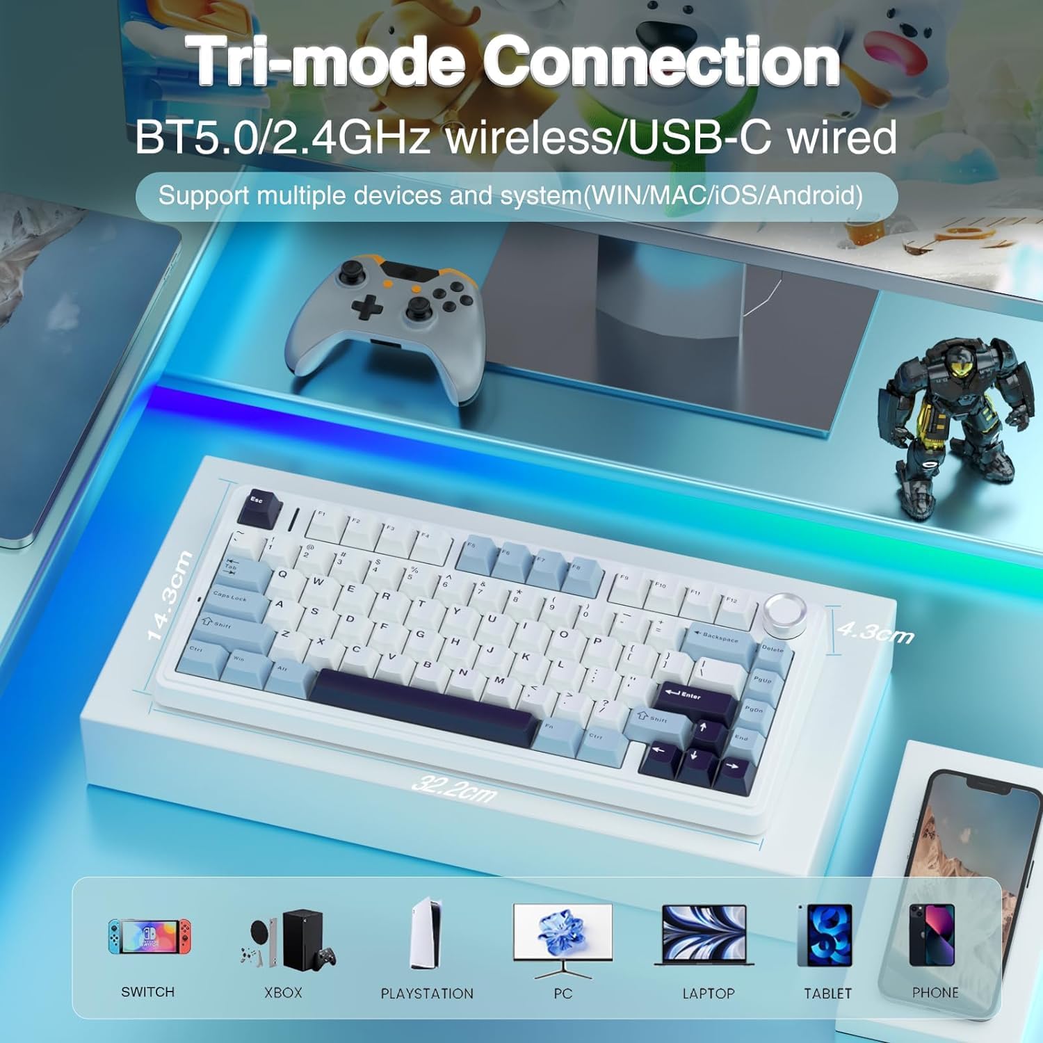 - 【Professional Gaming Keyboard】No matter the outlook, the construction, or the function, F75 mechanical keyboard is definitely a professional gaming keyboard. This 80-key 75% layout compact keyboard can save more desktop space while retaining the necessary arrow keys for gaming. Additionally, with the multi-function knob, you can easily control the backlight and Media.