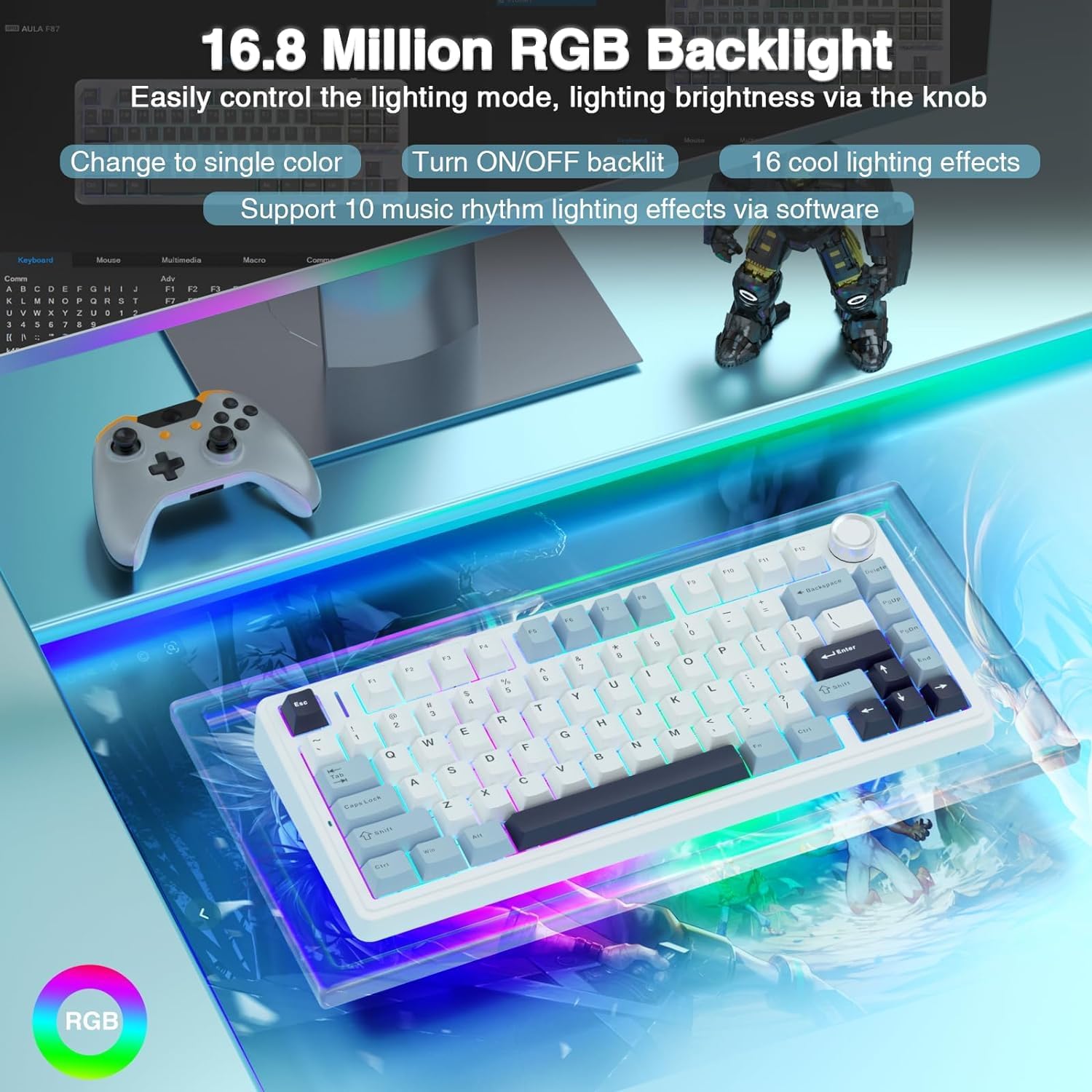 - 【16.8 Million RGB Backlit】F75 light up led keyboard features 16.8 million RGB lighting color. With 16 pre-set lighting effects to add a great atmosphere to the game. And supports 10 cool music rhythm lighting effects with driver. Lighting brightness and speed can be adjusted by the knob or the FN+key combination. You can select the single color effect as wish. And you can turn the backlight off if you do not need it.