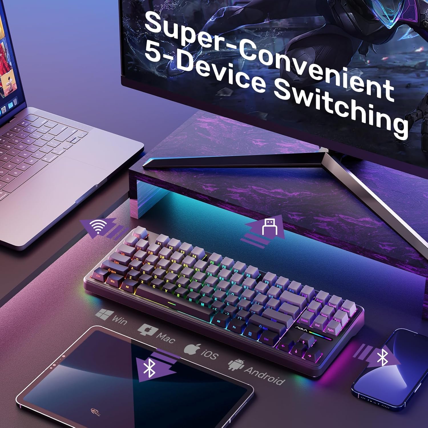 - MULTI-DEVICE CONNECTION: AULA F87 Pro Keyboard Wireless supports Bluetooth, 2.4GHz wireless and USB wired connectivity, which can be easily switched among 5 devices via shortcut keys or side keys. The creamy keyboard is suitable for applying to various environments such as home, office, outdoor, etc! It can meet all user's needs.4000mAh high-capacity battery, long battery life, no need to change/charge the battery frequently