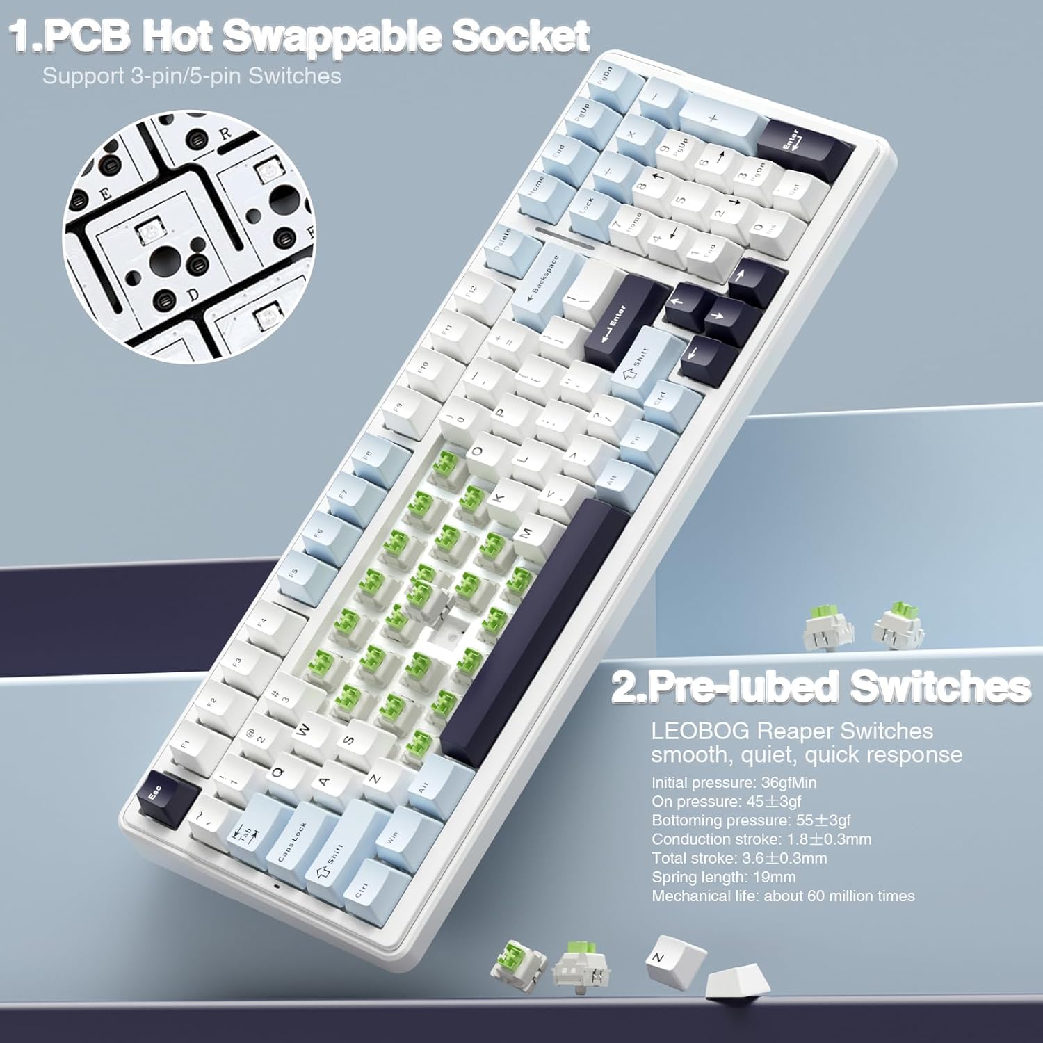 - 【PBT Keycaps & 8000 mAh Battery】99 keys 96% layout compact keyboard can save more desktop space while keep necessary arrow keys and number area for games and work. The rechargeable keyboard built-in 8000 mAh large capcacity battery to provide more power and longer battery life. Double shot PBT keycaps, made from two colors material molded into each others, make the keycaps characters maintain the vibrance and saturation, clear and not fade.