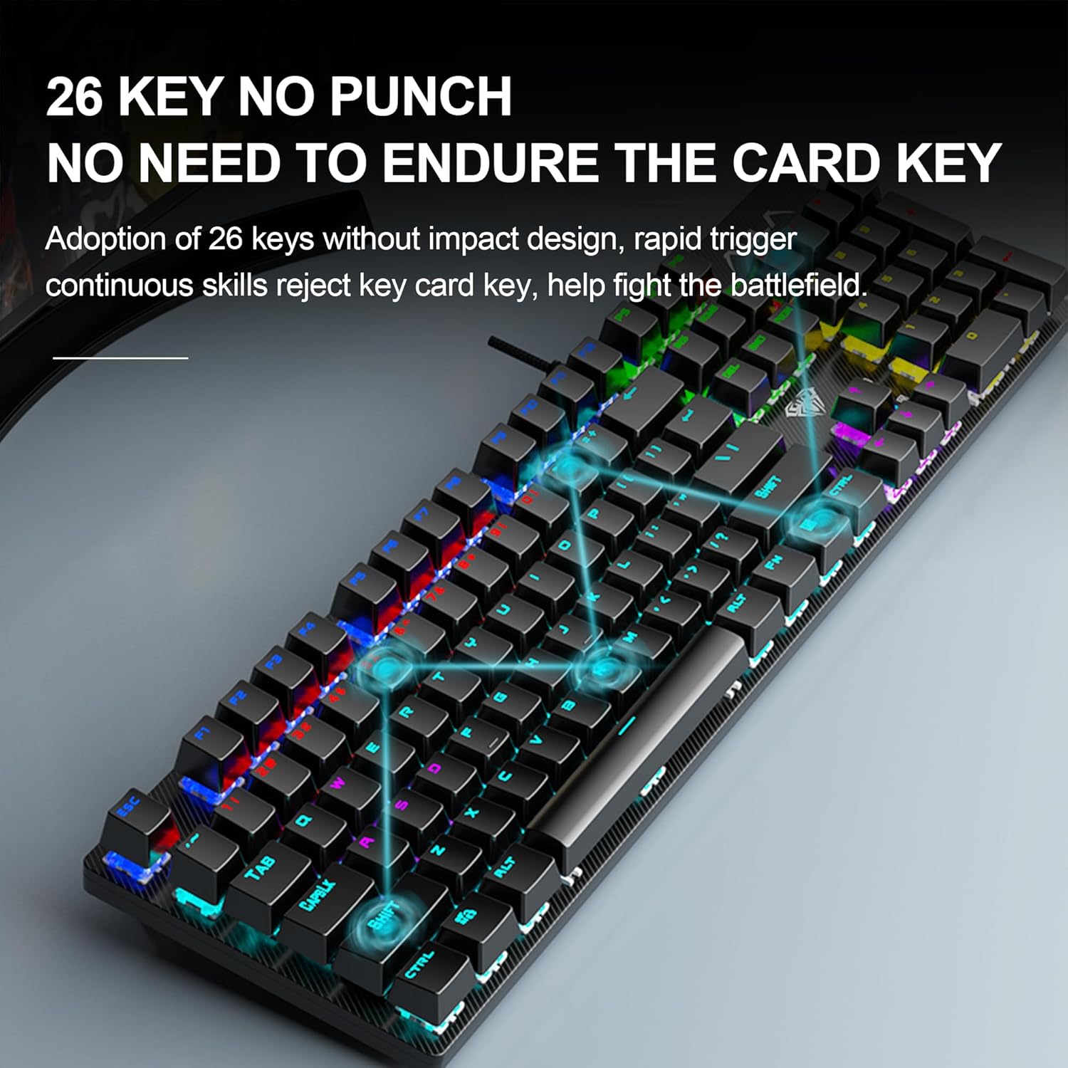 - 🎮🏆🎮【26-KEYS ROLLOVER & ERGONOMIC DESIGN】26-key rollover anti-ghosting technology design to work simultaneously during intense gaming. Win lock function frees your worry about mistyping when gaming or typing. The classic two-color injection suspension keycaps are used to make the fonts wear-resistant and not easy to fade, with good light transmittance and clear fonts. Waterproof and easy to clean. Ergonomic high and low stepped Buttons arrangement layout, typing convenient comfortable.