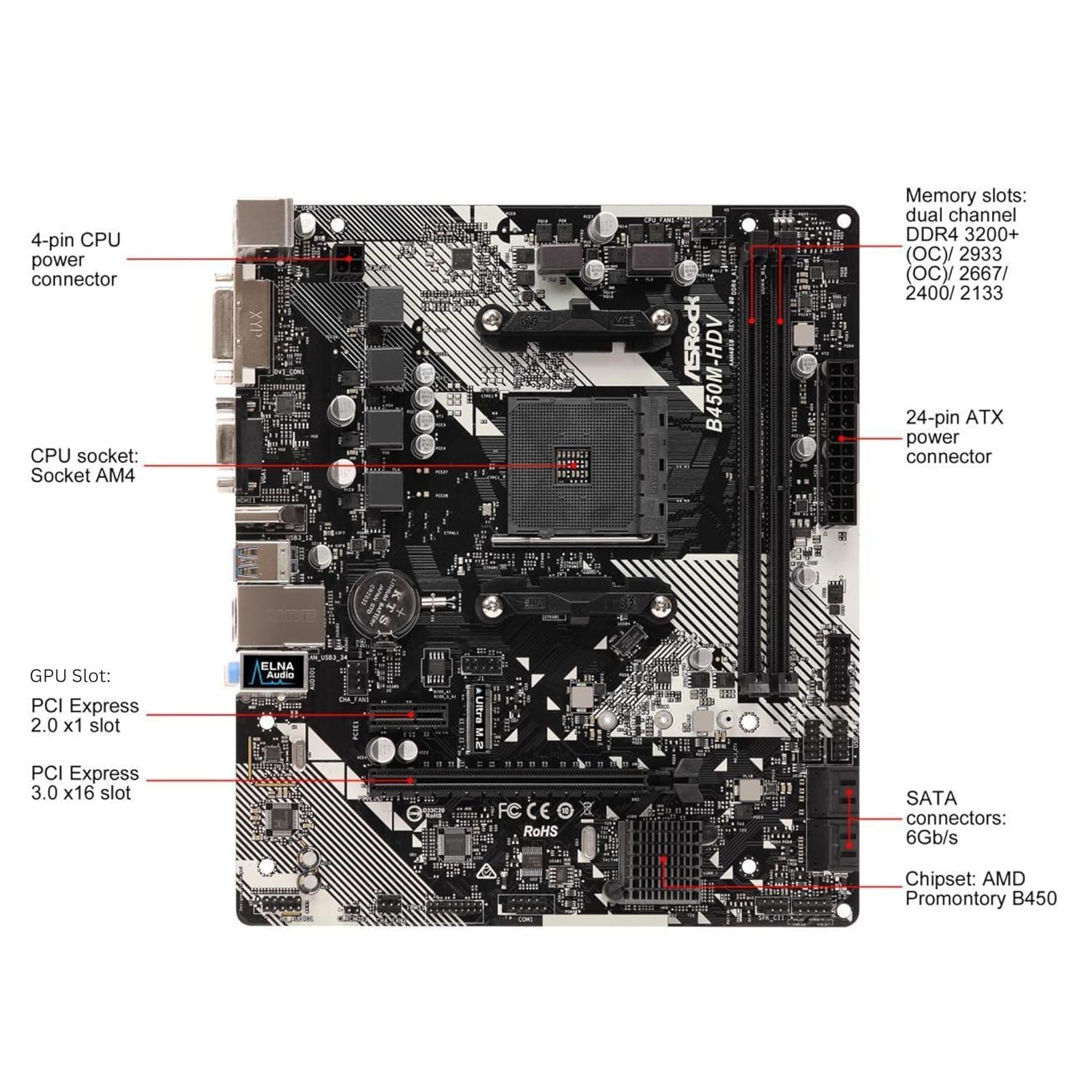 - AMD AM4 Socket with support for Ryzen 3, 5, 7, 9 Series and Athlon processors. Based on High Density Glass Fabric PCB design reducing the gaps between the PCB layers to protect the motherboard against electrical shorts caused by humidity.