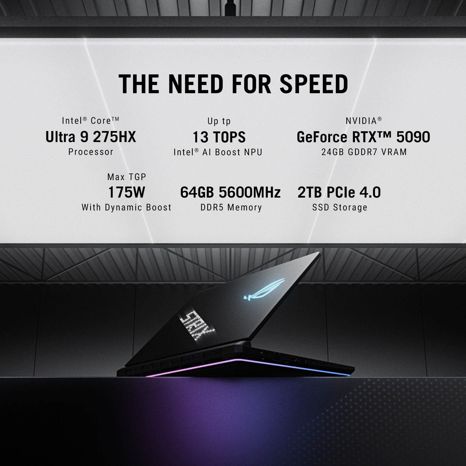 - Graphics: 24GB GDDR7 NVIDIA® GeForce RTX™ 5090 Laptop GPU ROG Boost: 1647MHz* at 175W (1597MHz Boost Clock+50MHz OC, 150W+25W Dynamic Boost) || MUX Switch + NVIDIA® Advanced Optimus
