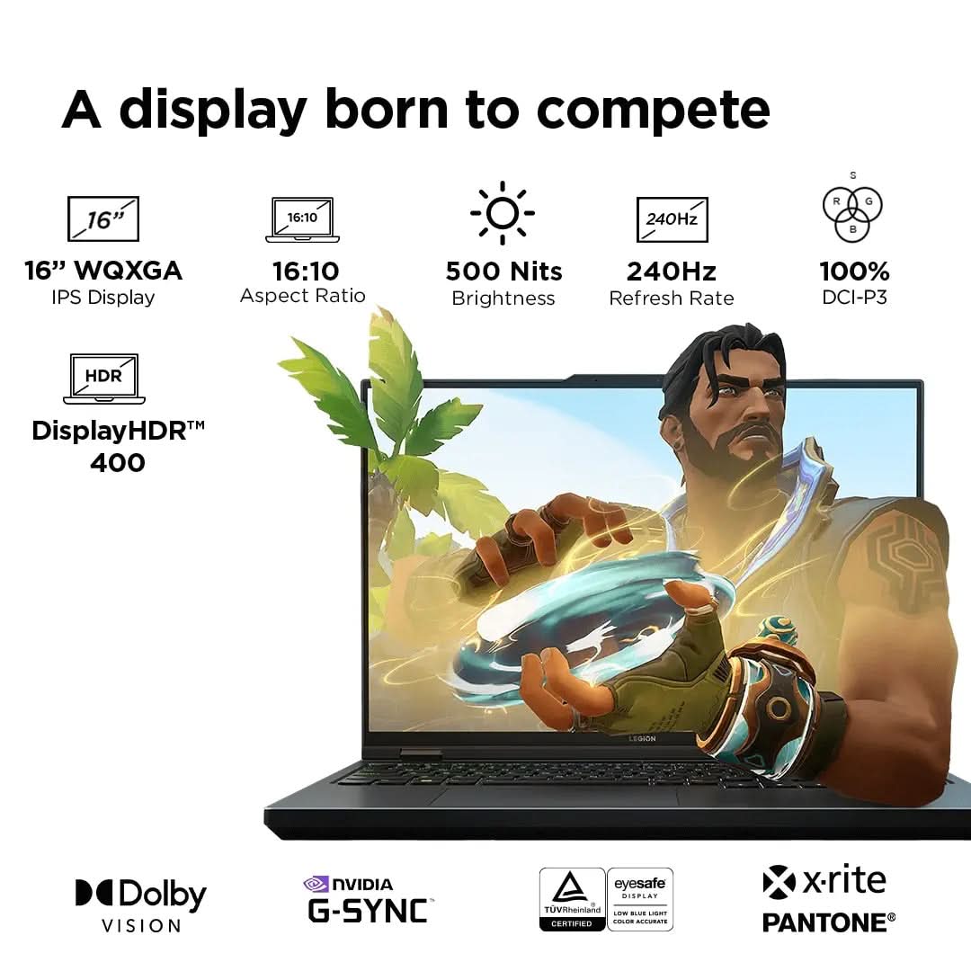 Display: 16" WQXGA (2560x1600) IPS Dolby Vision | 240 Hz Refresh Rate |Brightness: 500Nits Anti-glare | 100pct. DCI-P3 || Connectivity : Wifi 6E 11ax (2x2) | Bluetooth 5.2