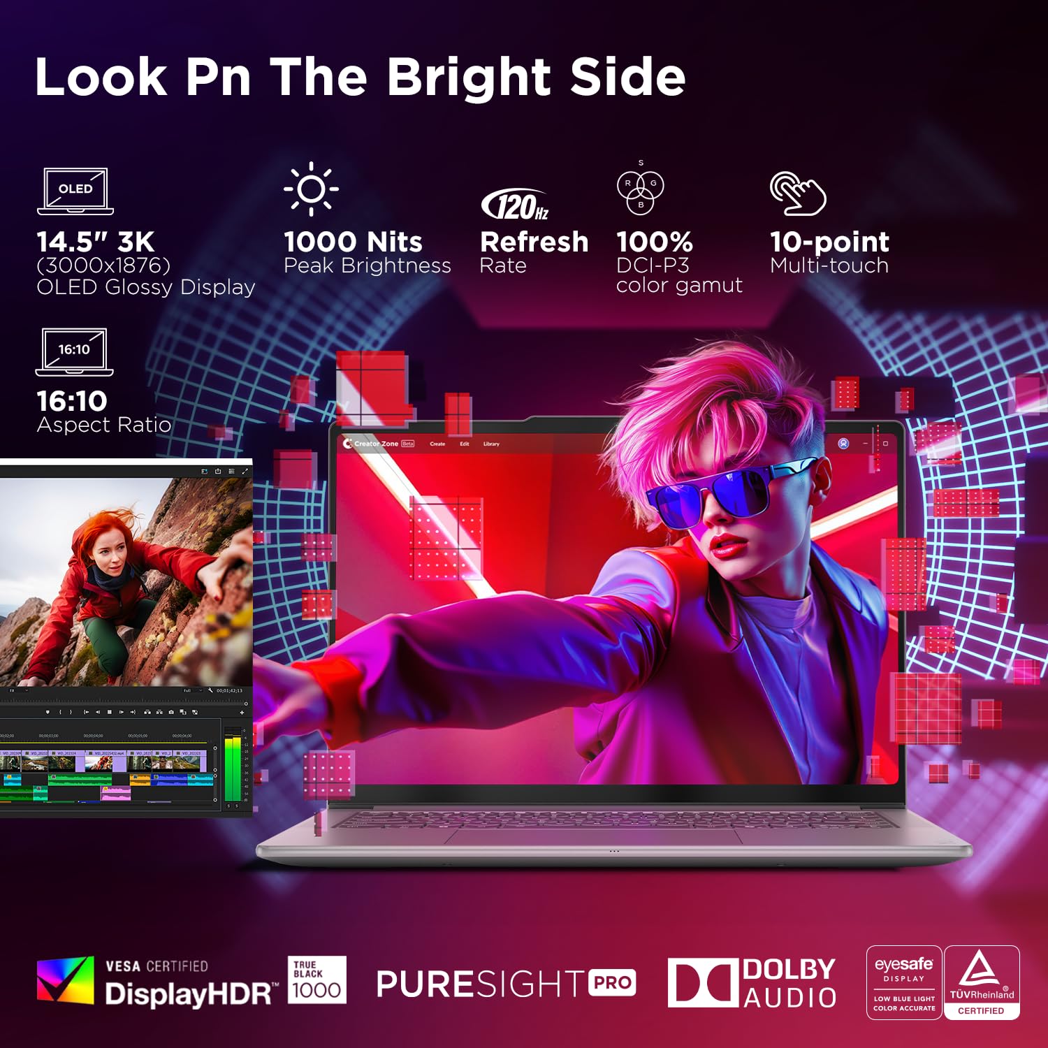 - Display: 14.5" 3K OLED (3000x1876) | Touchscreen | 1000Nits Peak Brightness, 500Nits Typical Brightness | 120Hz Refresh Rate | 100% DCI-P3 |DisplayHDR True Black 1000 | X-Rite, PureSight Pro| Dolby Vision | Anti Glare |TUV Low Blue Light Certified