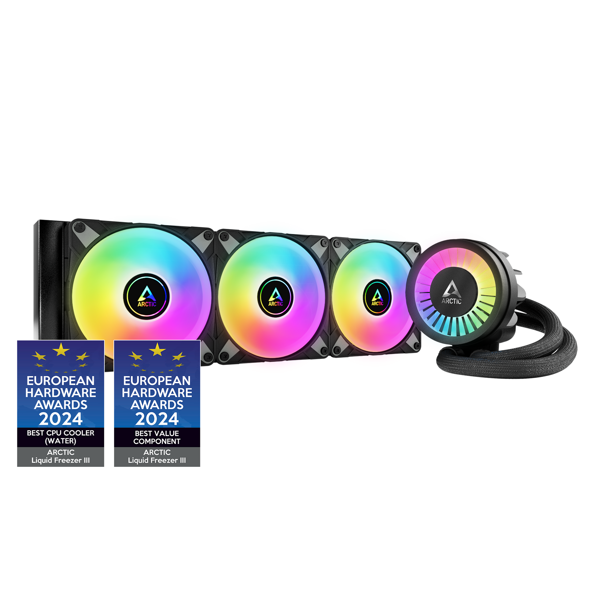 The Liquid Freezer III offers outstanding cooling performance in four different sizes and three variants. While the Black version is completely black, the A-RGB versions are available in black or white and have digitally addressable lighting for the pump head and radiator fans. With radiator sizes of 240, 360, 280 and 420, the Liquid Freezer III offers the ideal combination of performance, technology and design for everyone!