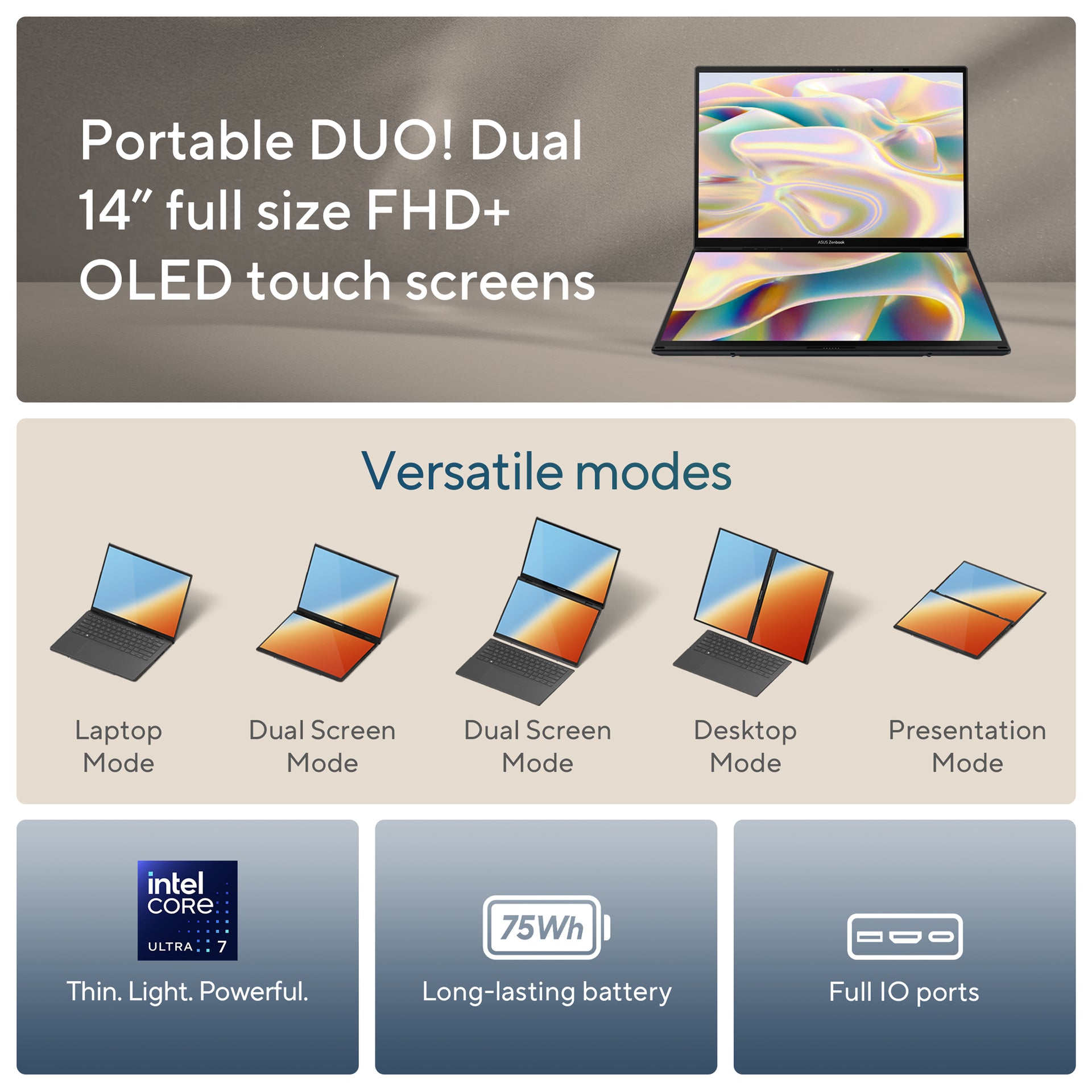 Comes with Intel® Core™ Ultra processor with an integrated Neural Processing Unit (NPU) for AI acceleration, LPDDR5x memory, and PCIe® 4.0 SSD. The NPU delivers low-latency AI computing, accelerating multitasking to make Zenbook DUO highly efficient for work, creativity, and entertainment.