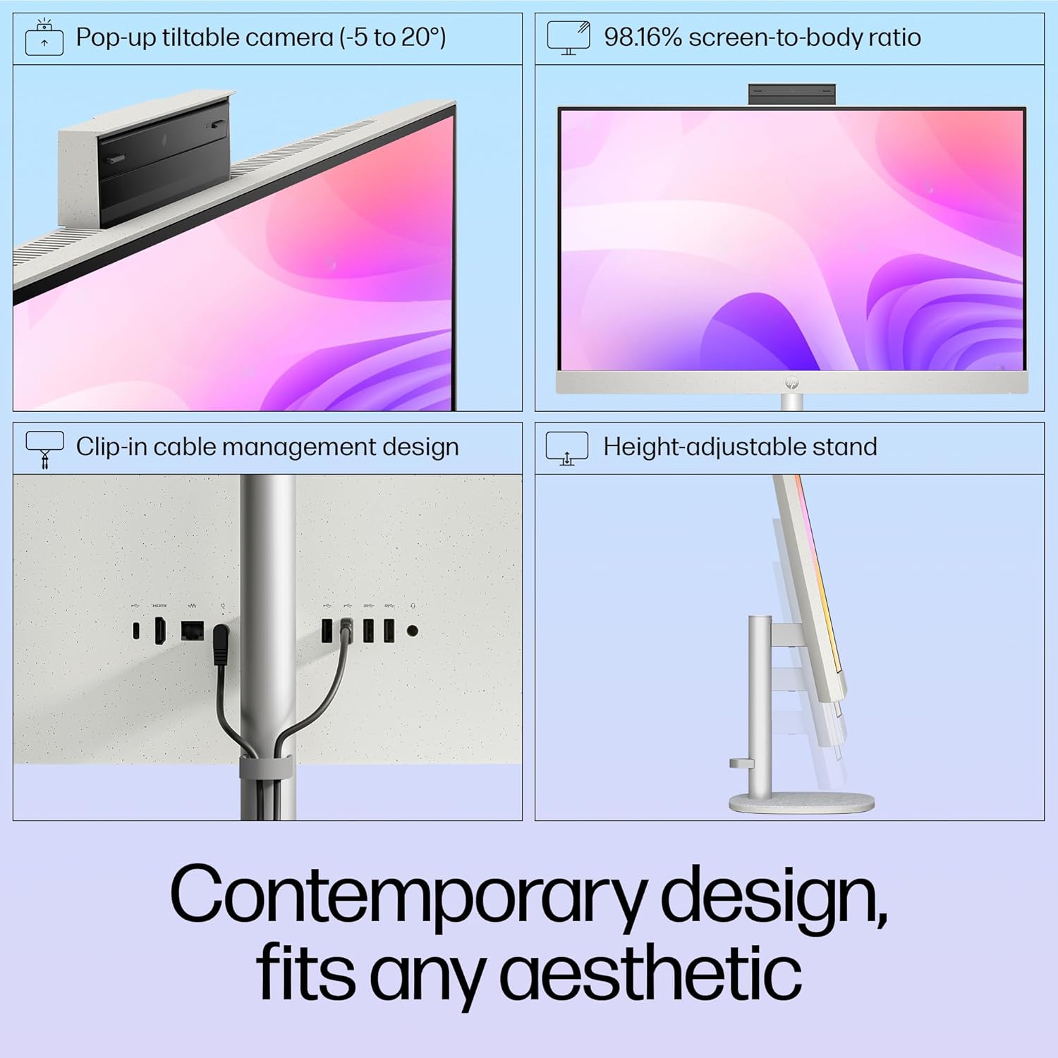 | Display | Size: 68.6 cm (27") Resolution: FHD (1920 x 1080) Panel Type: IPS Brightness: 300 nits Color Accuracy: 99% sRGB Touchscreen: No Bezel: Three-sided micro-edge Flicker-Free: Yes Screen-to-Body Ratio: 98.16% |