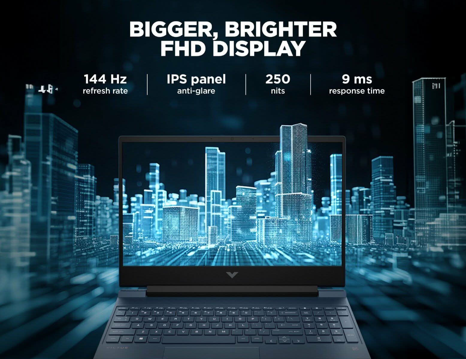 Screen Size: 39.6 cm (15.6) diagonal, FHD (1920 x 1080), 144 Hz, 9 ms response time, IPS, micro-edge, anti-glare, 250 nits, 45% NTSC