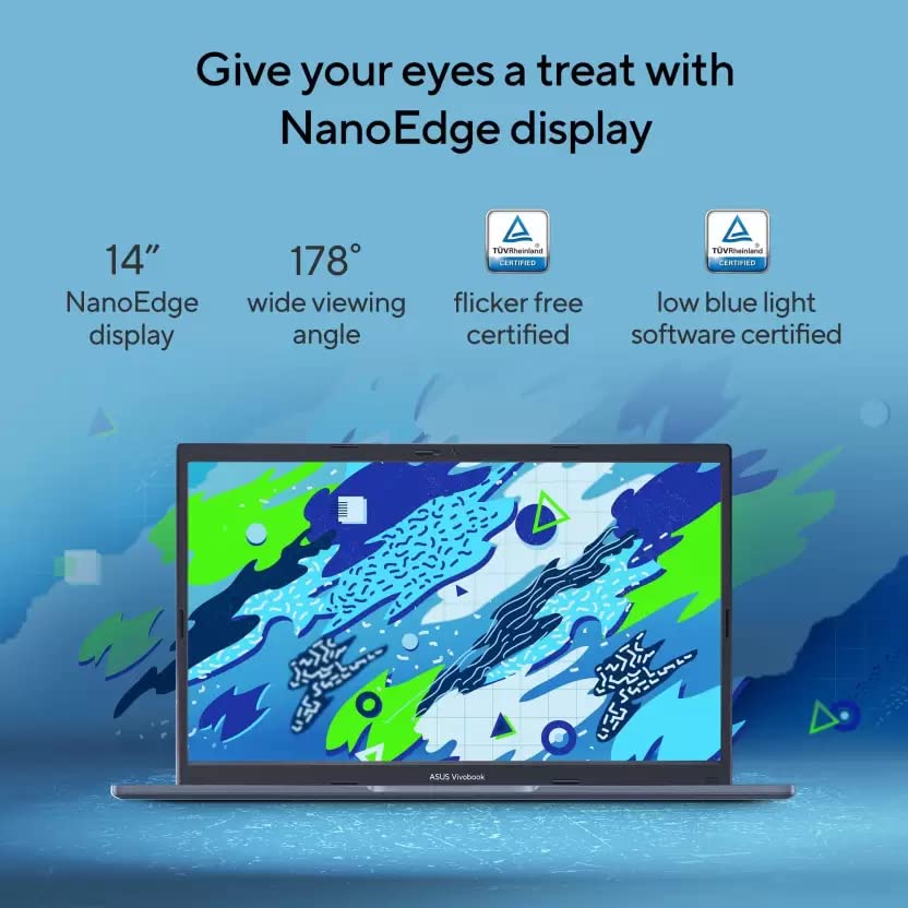 - The accurate 16:9 aspect ratio and stunning 35.56 cm (14) Full HD display with 1920 x 1080 resolution on this laptop enhance your visual experience in a multitude of ways. Your eyes also can enjoy the Vivobook 14's minimal bezel and 82% screen-to-body ratio NanoEdge display, which is brilliant and captivating.