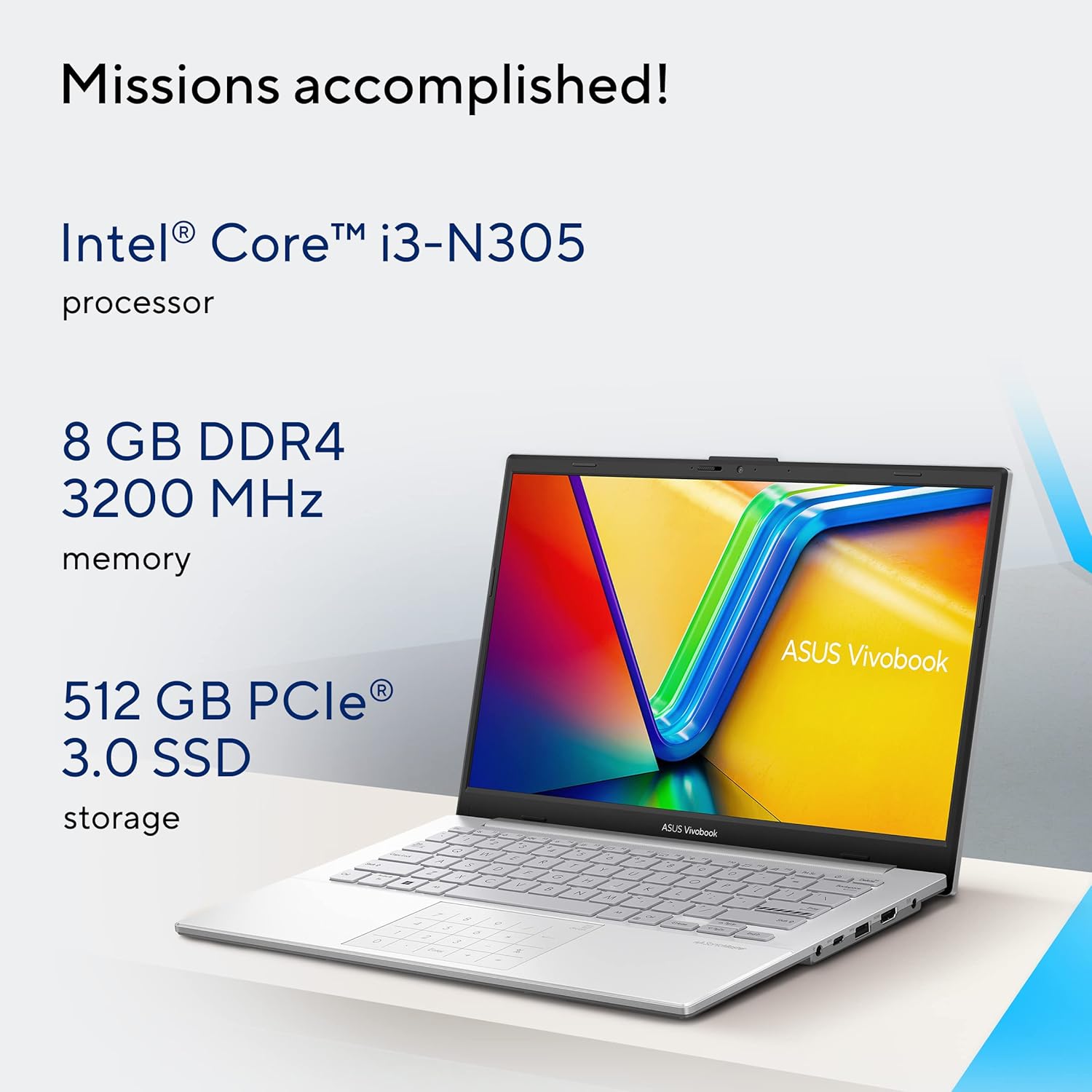 - ASUS VIVOBOOK GO 14 2023, INTEL CORE I3-N305, 14" (35.56 CMS) FHD, THIN & LIGHT LAPTOP (8GB/512GB SSD/WIN11/OFFICE 2021/42WHR/COOL SILVER/1.38 KG), E1404GA-NK321WS