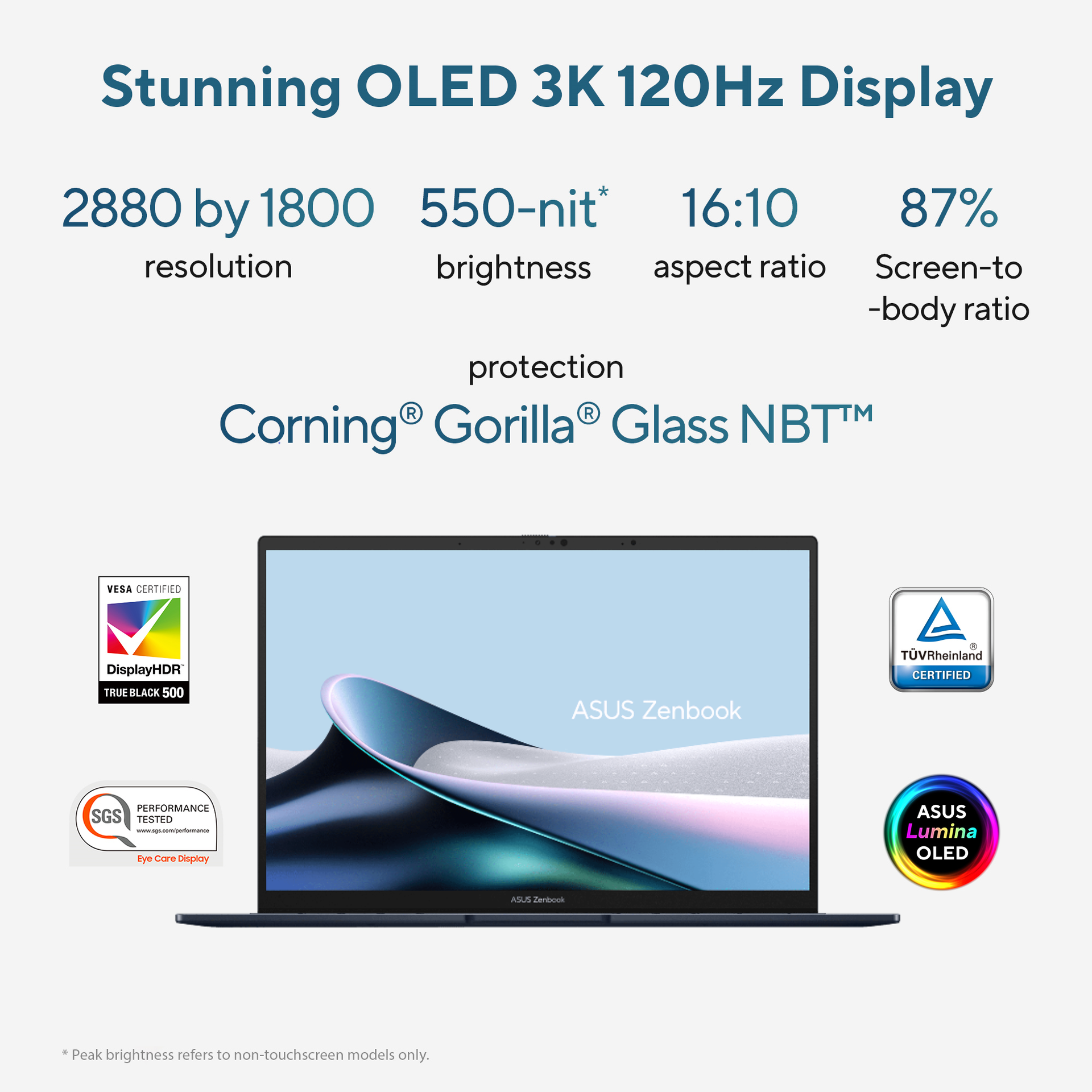 Featuring a 35.56 cm (14) 3K 120 Hz 16:10 OLED HDR display with 500 nits peak brightness, you can enjoy sharp detail and ultra-vivid colors. SGS and TUV-certified low blue-light levels care for your eyes during long screen sessions. Adaptive sync automatically adjusts the refresh rate for always-smooth visuals.