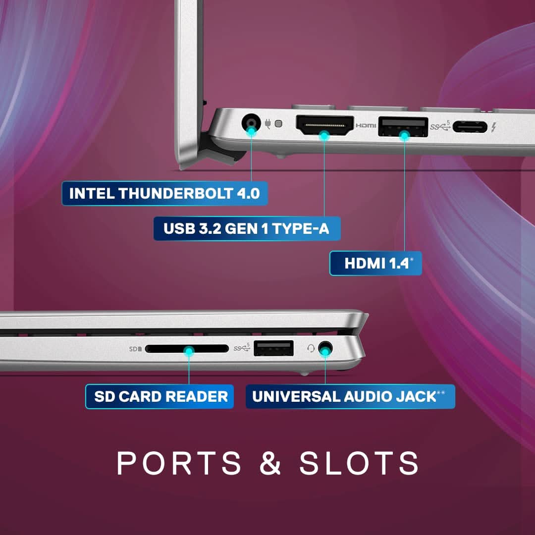 - Ports: HDMI 1.4*, (1) Intel Thunderbolt 4.0, (2) USB 3.2 Gen 1 Type-A, SD card reader, (1) Universal Audio Jack