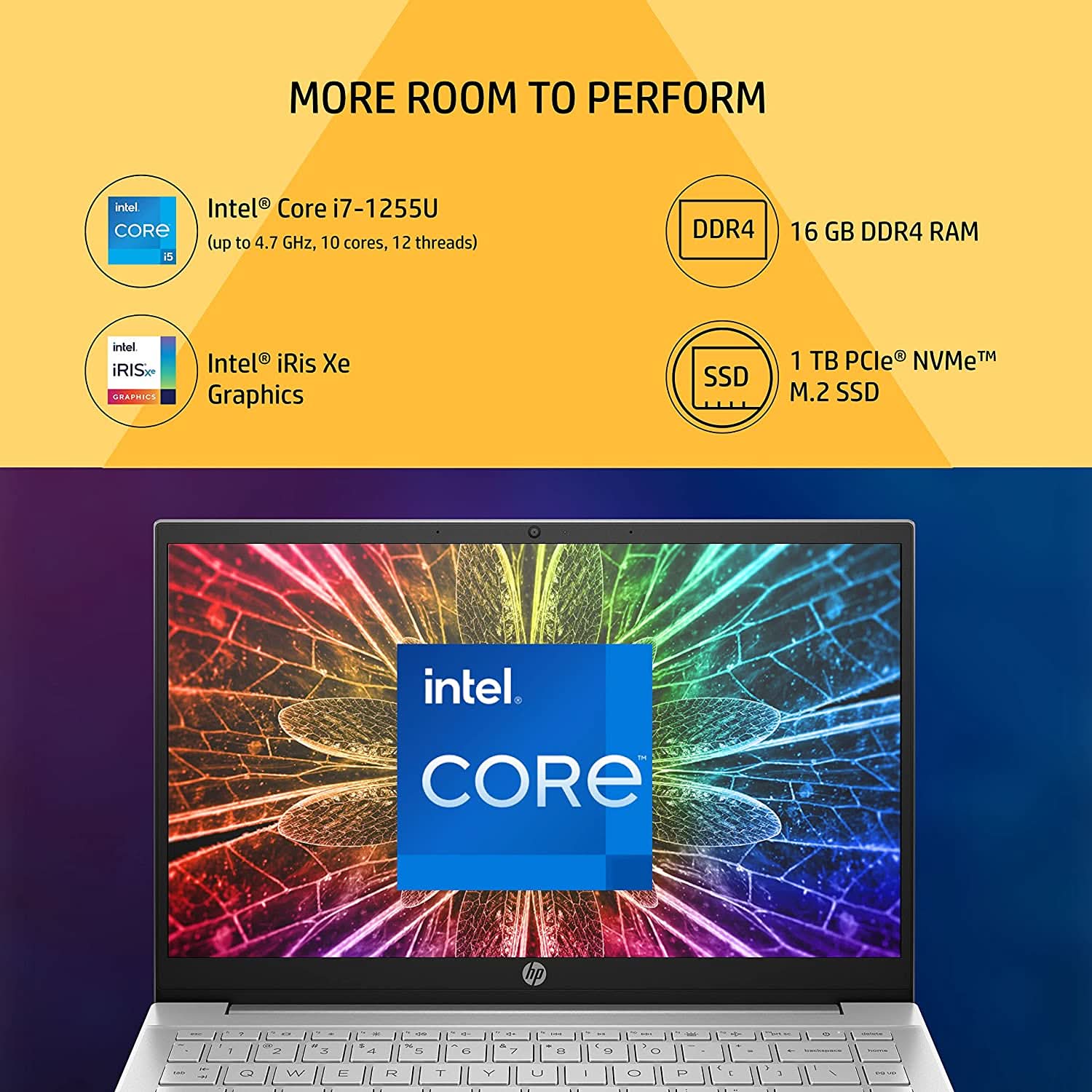 Do Check Partner offer section for Exciting offers from HP Processor: Intel Core i7-1255U (up to 4.7 GHz with Intel Turbo Boost Technology(2g),12 MB L3 cache, 10 cores, 12 threads)| Memory & Storage: 16 GB DDR4-3200 SDRAM (2 x 8 GB)| Storage: 1 TB PCIe NVMe M.2 SSDDisplay & Graphics: 35.6 cm (14") diagonal, FHD, IPS, micro-edge, BrightView, 250 nits, 157 ppi | Graphics: Intel UHD Graphics;Operating System & Pre-installed Software: Pre-loaded Windows 11 Home 64 Single Language| Microsoft Office Home & Student 2021|McAfee LiveSafe (30 days free trial as default)| Pre-installed Alexa built-in- Your life simplified with Alexa. Just ask Alexa to check your calendar, create to-do lists, shopping lists, play music, set reminders, get latest news and control smart home.