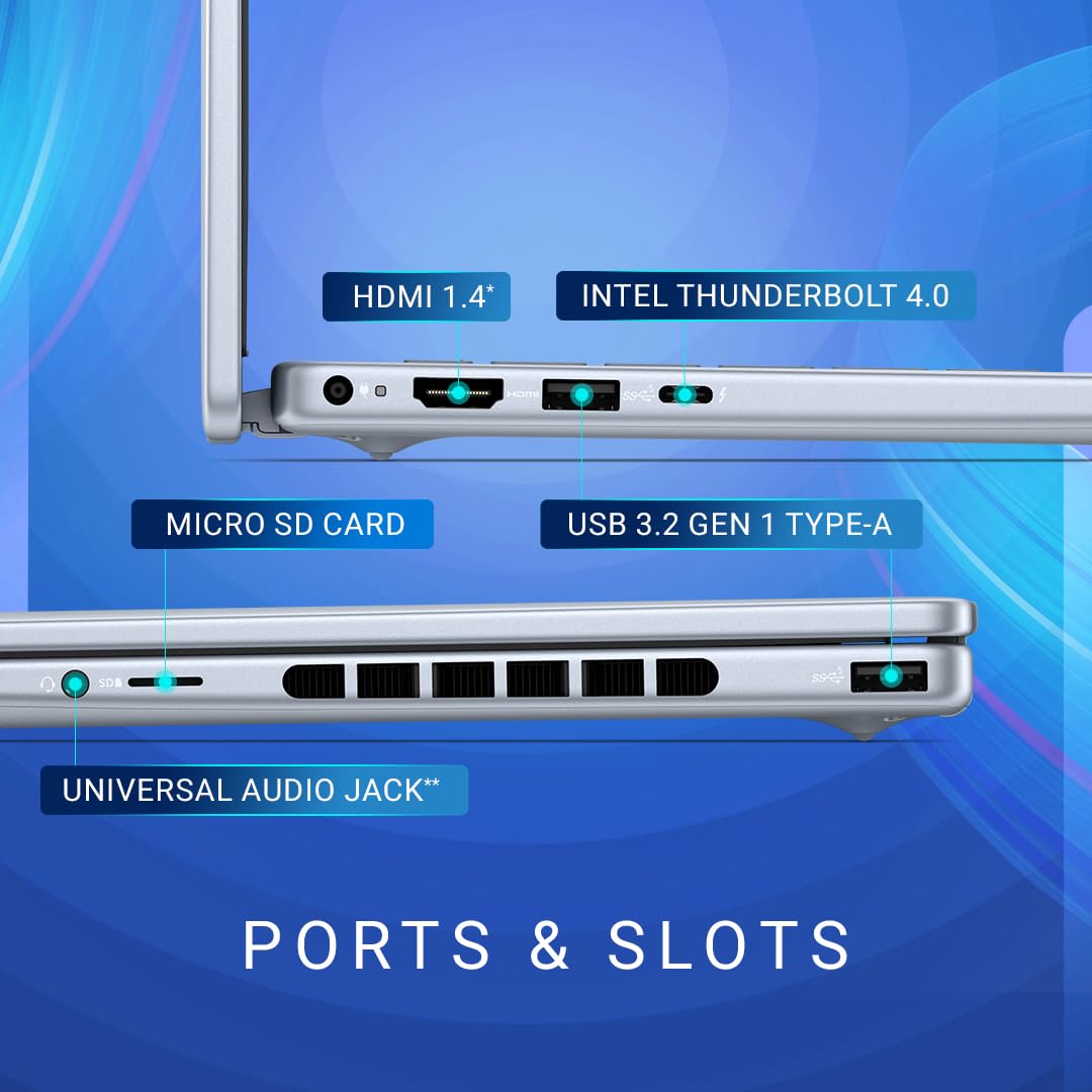 - Ports: HDMI 1.4*, (1) Intel Thunderbolt 4.0, (2) USB 3.2 Gen 1 Type-A, Micro SD Card, (1) Universal audio jack