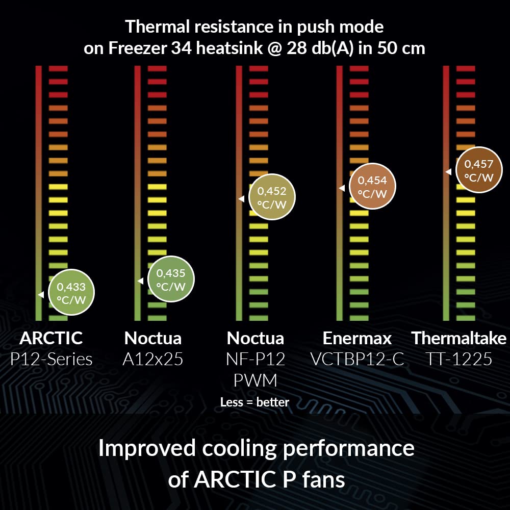 During the development of the new P12 PWM PST, special emphasis was placed on a focused airstream and thus a high static pressure. The fan guarantees extremely efficient cooling, even with increased air resistance. Therefore, the P12 PWM PST is particularly suitable for use on heatsinks and radiators.