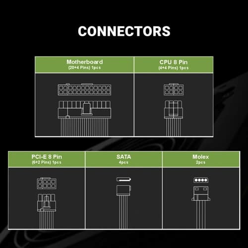 Featuring a versatile range of connectors, including an ATX 24-pin, 4+4 Pin EPS (CPU), 6+2 Pin PCIe, 4 SATA, and 2 Molex connectors, this gaming PSU easily powers various components. Thanks to these options, setting up a gaming system or upgrading existing parts becomes seamless, ensuring compatibility across different hardware configurations for stress-free installation.