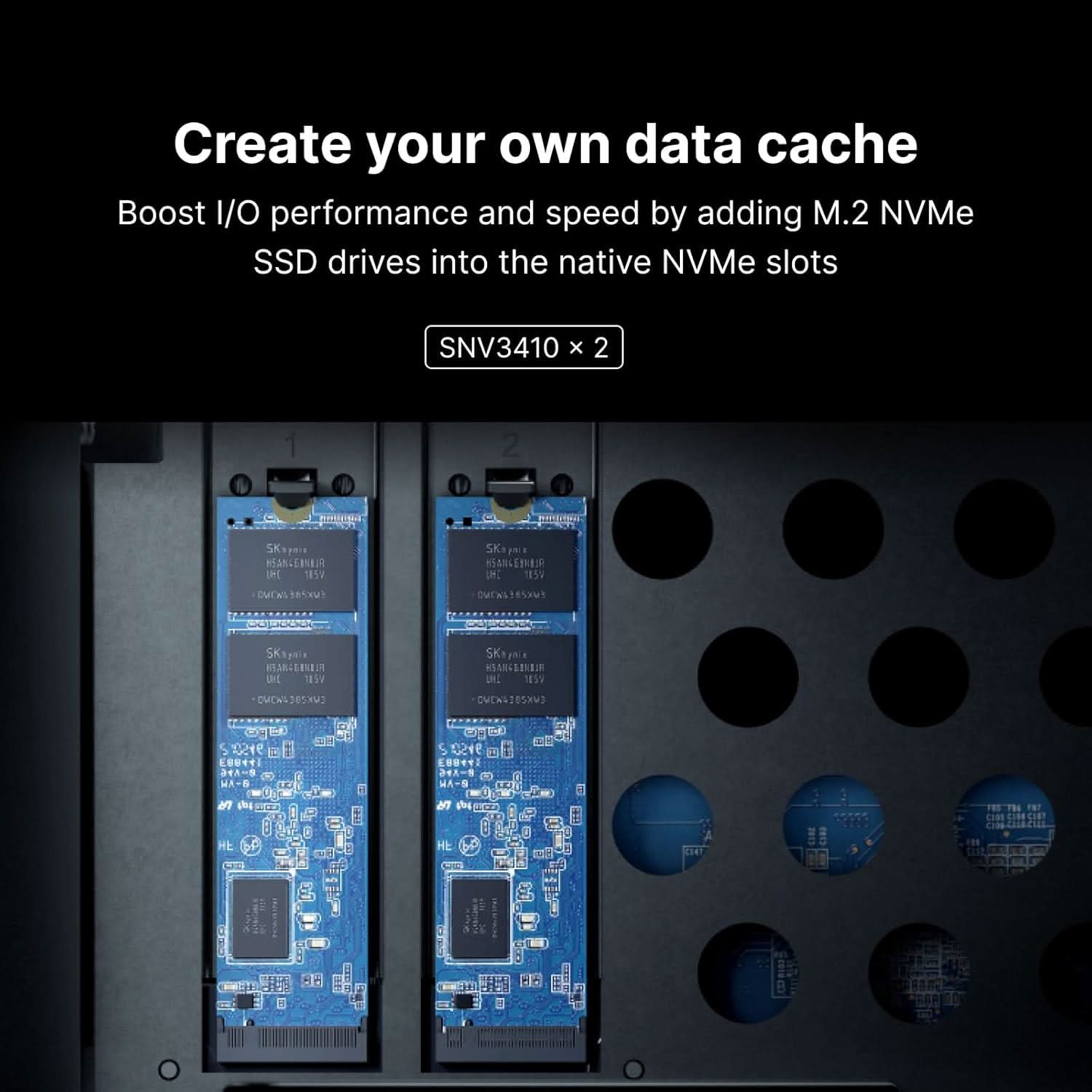 - Turbocharge HDD arrays by 20x or more2 without occupying drive bays using dual built-in M.2 slots for NVMe SSD cache3
