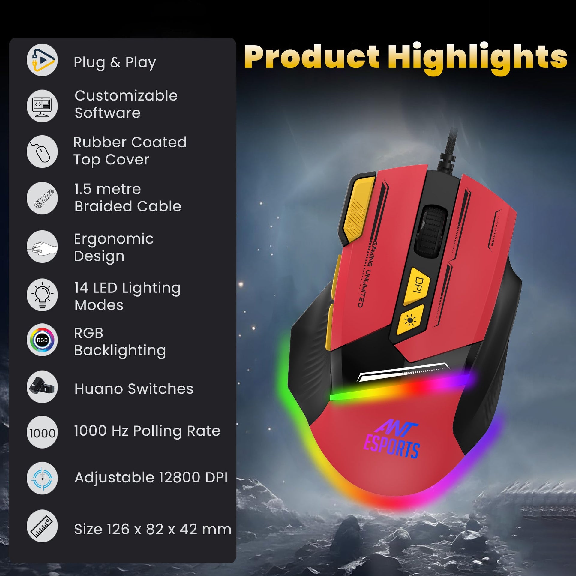 - Ant Esports GM333 Wired Optical Ergonomic design Gaming Mouse with 12800 DPI 1.5m braided cable – Black/White/Yellow
