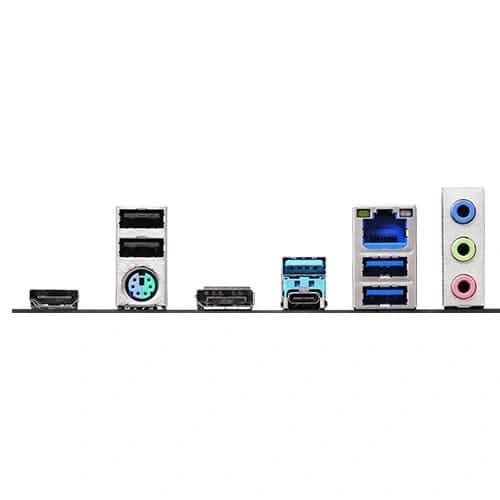 | Back Panel I/O Ports | 2 x Antenna Ports 1 x PS/2 Mouse/Keyboard Port 1 x HDMI Port 1 x DisplayPort 1.4 1 x USB 3.2 Gen1 Type-C Port 3 x USB 3.2 Gen1 Type-A Ports 2 x USB 2.0 Ports 1 x RJ-45 LAN Port HD Audio Jacks: Line in / Front Speaker / Microphone |
