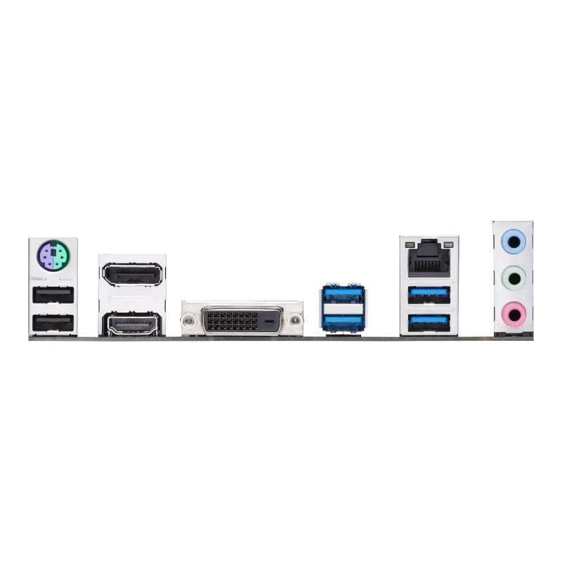 | Back I/O Ports | 4 x USB 3.2 Gen 1 Type-A,1 x PS/2 keyboard/mouse combo port(s),1 x DVI-D,1 x DisplayPort,1 x HDMI,1 x LAN (RJ45) port(s),2 x USB 2.0,3 x Audio jack(s) |