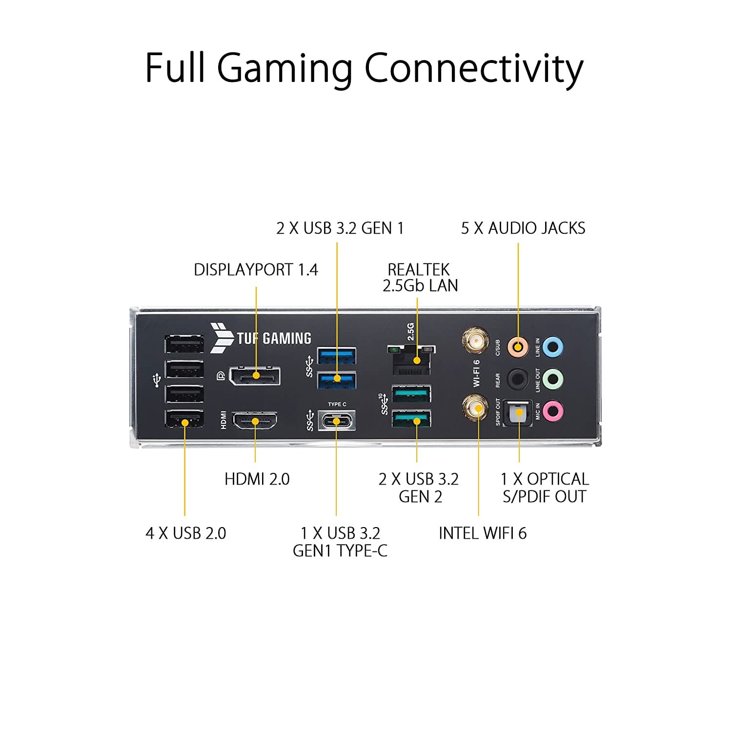 | Back Panel I/O Ports | 2 x USB 3.2 Gen 2 port(s) (2 x Type-A) 3 x USB 3.2 Gen 1 port(s) (2 x Type-A, 1 x USB Type-CÆ) 4 x USB 2.0 port(s) (4 x Type-A) 1 x DisplayPort 1 x HDMIô port 1 x ASUS Wi-Fi Module 1 x Realtek 2.5Gb Ethernet port 5 x Audio jacks 1 x Optical S/PDIF out port |