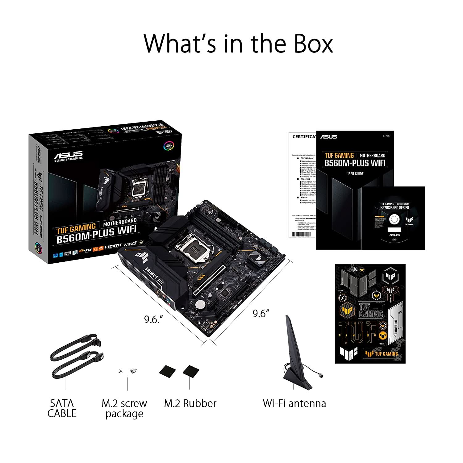| Accessories | Cables 2 x SATA 6Gb/s cables Miscellaneous 1 x ASUS Wi-Fi moving antennas 1 x M.2 Rubber Package(s) 1 x M.2 SSD screw package(s) 1 x TUF Gaming sticker Installation Media 1 x Support DVD Documentation 1 x TUF Certification card 1 x User manual |