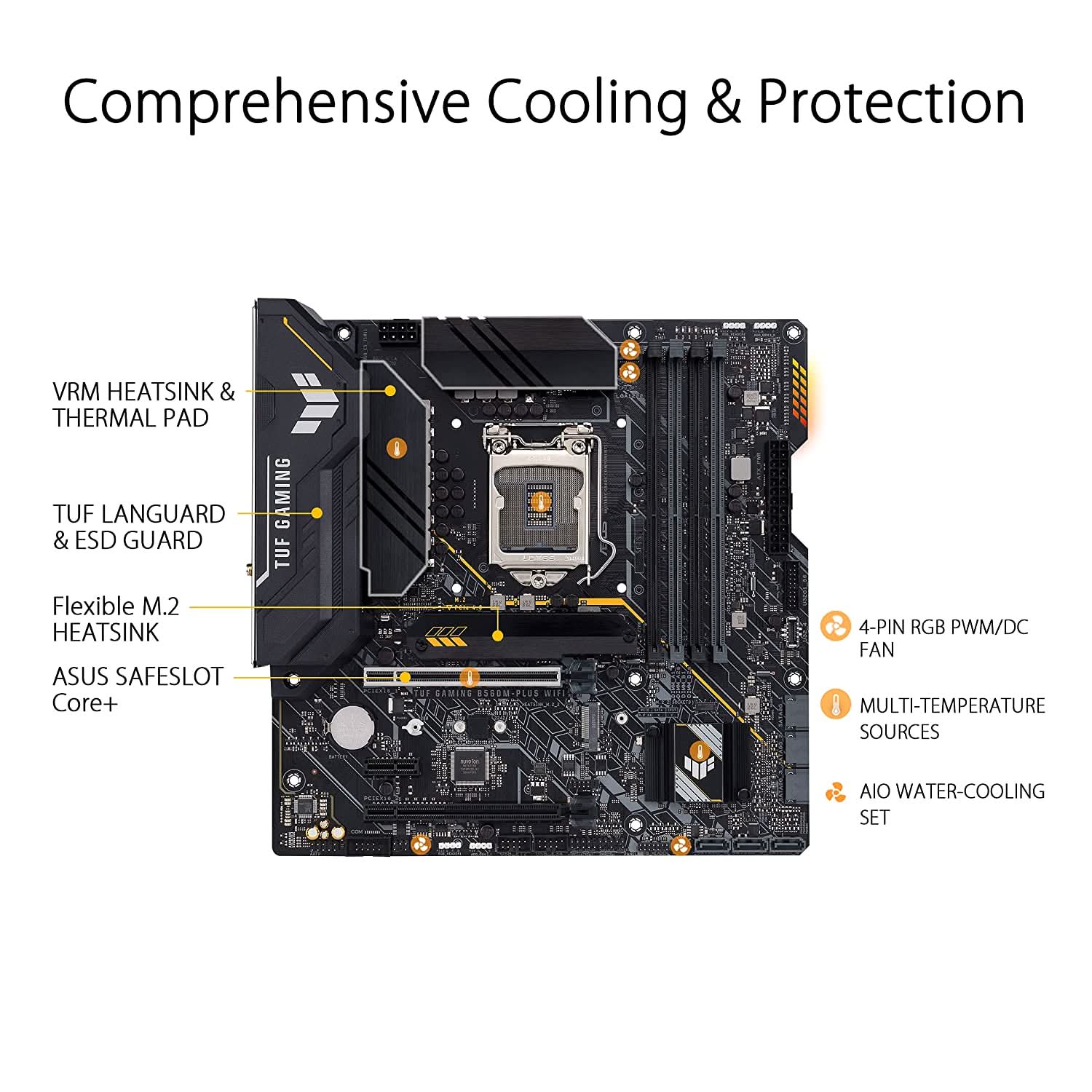 | Special Features | ASUS TUF PROTECTION - Digital power design with DrMOS - Enhanced DRAM Overcurrent Protection - ESD Guards - TUF LANGuard - Overvoltage Protection - SafeSlot Core+ - Stainless-Steel Back I/O ASUS Q-Design - M.2 Q-Latch - Q-DIMM - Q-LED (CPU [red], DRAM [yellow], VGA [white], Boot Device [yellow green]) - Q-Slot ASUS Thermal Solution - Flexible M.2 heatsink - VRM heatsink design ASUS EZ DIY - ProCool - Pre-mounted I/O shield AURA Sync - AURA RGB header(s) - Addressable Gen 2 RGB header(s) |
