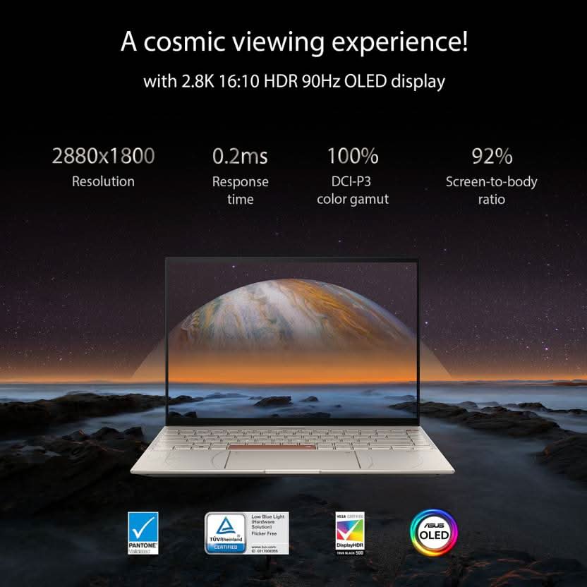 | Screen Type | OLED, LED Backlit, 16:10, 0.2ms response, 90Hz, 550nits HDR peak, 100% DCI-P3, 1.07B colors, Glossy Display, 70% less harmful blue light, SGS Eye Care Display, Screen-to-Body Ratio 92% |