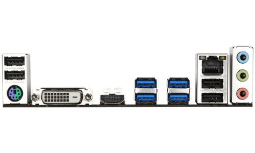 | 1 x PS/2 keyboard/mouse port 1 x DVI-D port 1 x HDMI port 4 x USB 3.1 Gen 1 ports 4 x USB 2.0/1.1 ports 1 x RJ-45 port 3 x audio jacks |