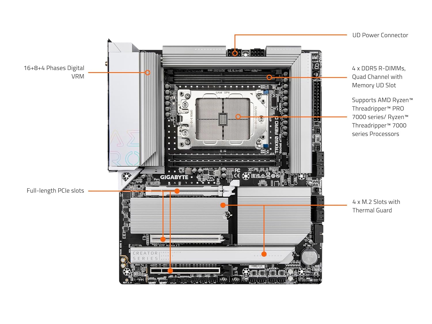 | CPU | AMD Socket sTR5, support for: AMD Ryzen Threadripper PRO 7000 processors / AMD Ryzen Threadripper 7000 Series processors (Go to GIGABYTE's website for the latest CPU support list.) |
