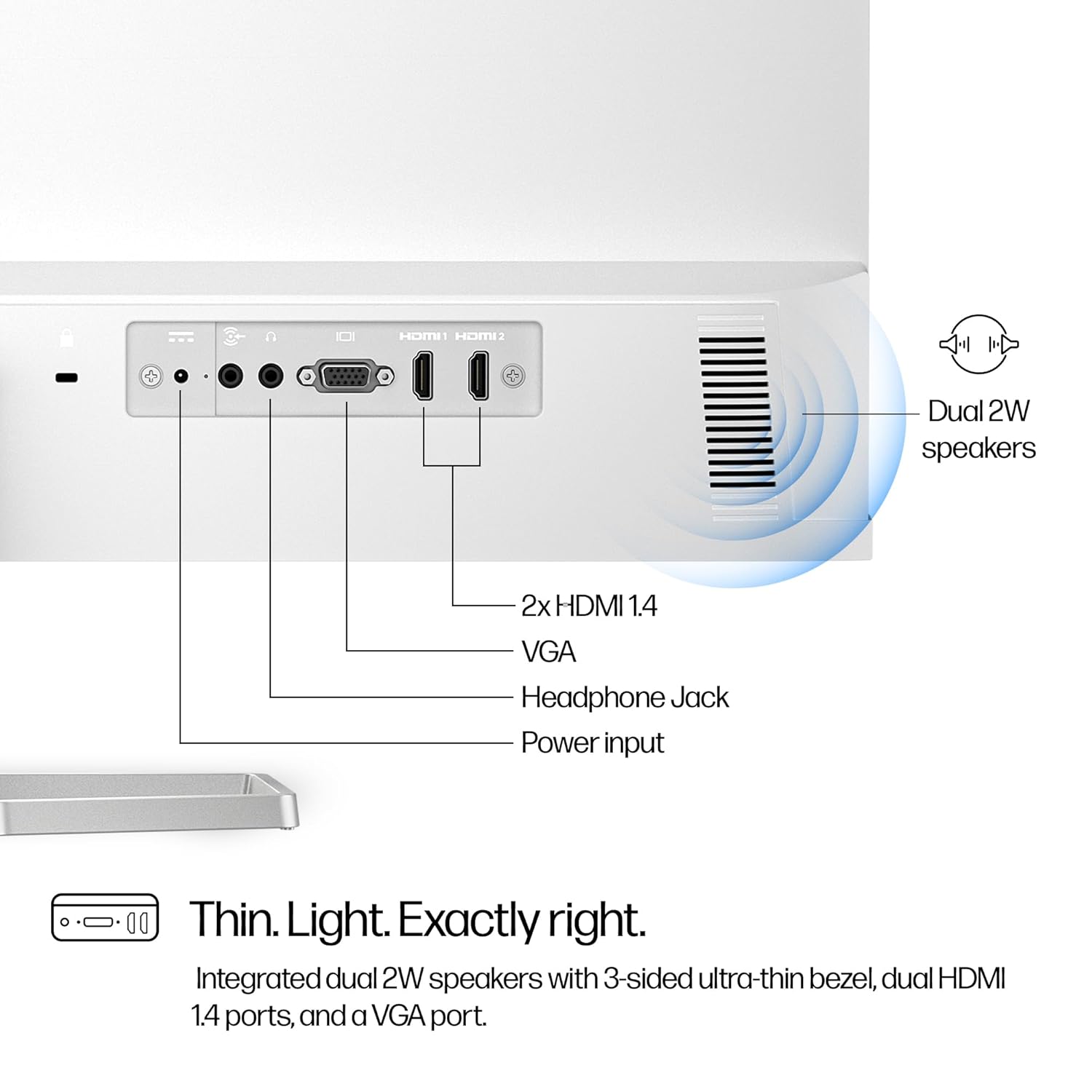 - [Thin. Light. Exactly right.] This thin-and-light 27" FHD monitor is designed to look great in any space. Whether learning, playing, or watching content, enjoy crisp audio with integrated dual 2W speakers. Its ultra-thin 3-sided borderless design lets you create a seamless dual-screen setup for enhanced viewing. Plus, have more options to connect with one VGA and two HDMI 1.4 ports.
