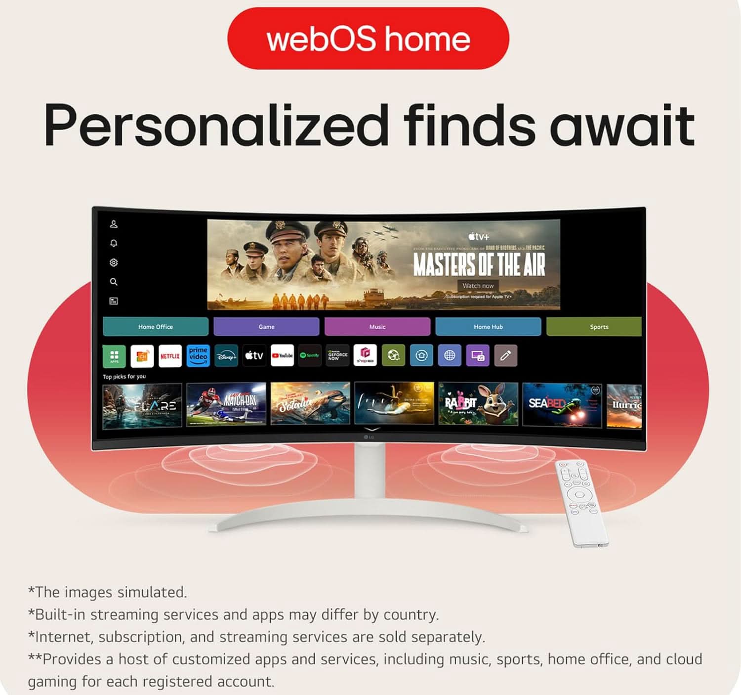 | Product Features | 21:9 Curved Ultrawide Smart Monitor, Built-In Speakers, HDR10, 99% sRGB(Typ.), Height/TiltAdjustment Stand, webOS, AirPlay2 |
